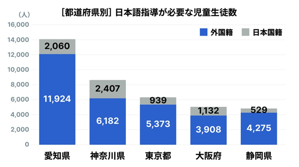 日本語指導を必要とする児童生徒は、他県と比べて圧倒的に多く、この状態はもう10年以上続いています。