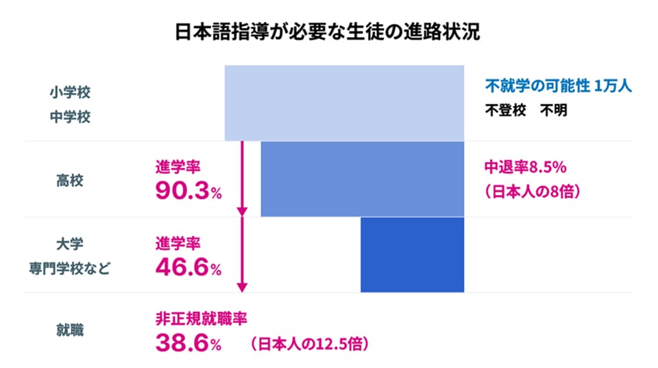 日本の公教育は「日本語だけ」で行われます。日本語が障壁となり、勉強が進まないことが原因で、学力がつかず、様々な段階でのドロップアウトが多くなります。